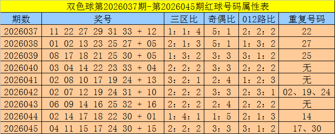 福彩双色球第2026045期奖号为:04 11 15 17 24 30 + 15,红球奇偶比为3:3,三区比为2:2:2,012路比为3:1:2,重号:17、30。
