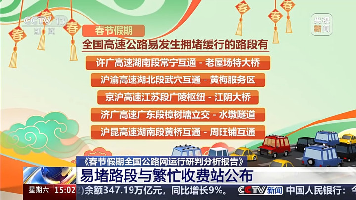 《春节假期天下高速公路路网驱动研判分析讲述》还发布了春节假期天下高速公路易发生拥挤缓行的路段和收费站。