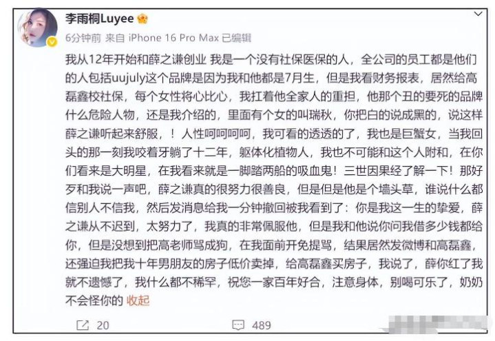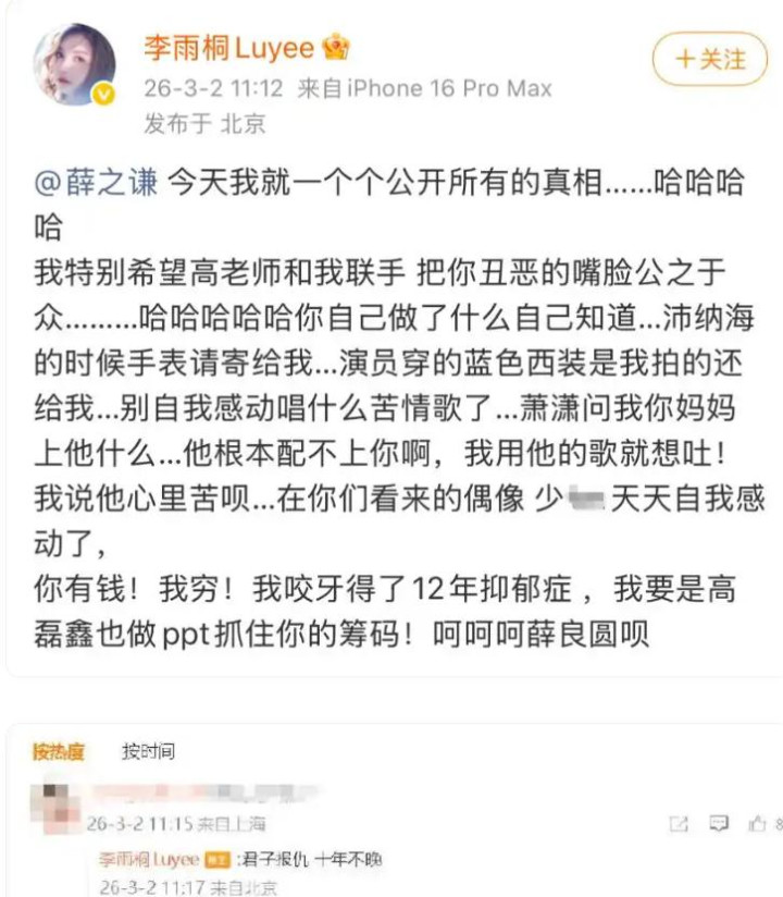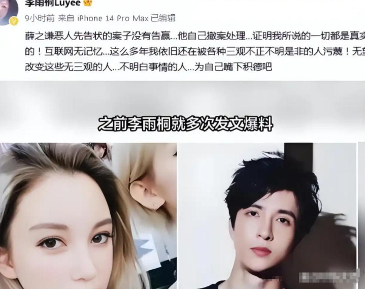 其时,李雨桐开始在酬酢平台发声,曝光了我方和薛之谦的地下恋情,以及薛之谦避讳婚配、骗取我方财帛的事情,