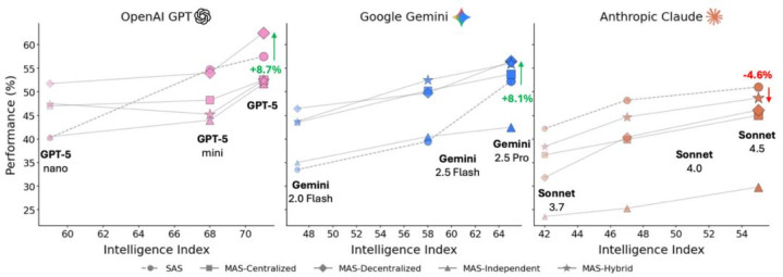对三大主要模子系列(OpenAI GPT、Google Gemini、Anthropic Claude)的性能相比,展示了不同的智能体架构若何跟着模子智能的擢升而膨胀,其中多智能体系统可能会笔据配置的不同而擢升或镌汰性能。