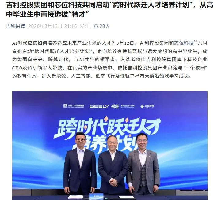 国内这边,造车巨头祥瑞最近推出“跨时间跃迁筹备”,径直面向高中生招聘,不是招过来打杂跑腿,而是让公司中枢业务板块的CEO切身带教,径直参与新动力、东说念主工智能、低空遨游这些最前沿的技俩,还配备学术导师和AI智能体导师,全标的培养,待遇和同岗亭负责职工持平。
