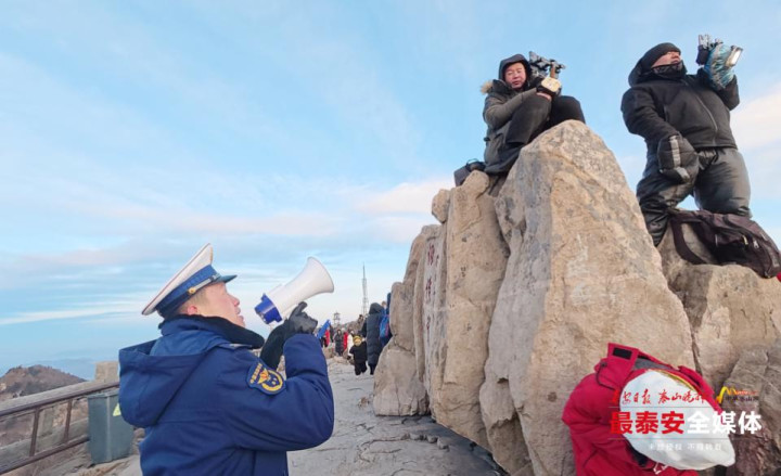 在玉皇顶准备国旗升空的吞并工夫,泰山另一处最好不雅日点——瞻鲁台,已被东说念主潮填满。“释怀吧,瞻鲁台这边没问题,派出所、景区东说念主员齐到了。收集主播也正在帮咱们一齐喊话看护次第……”王乐川回应。